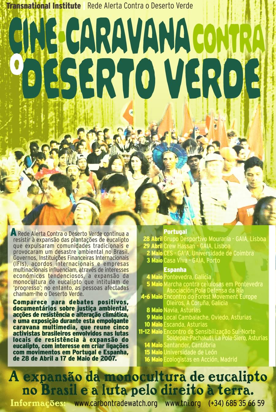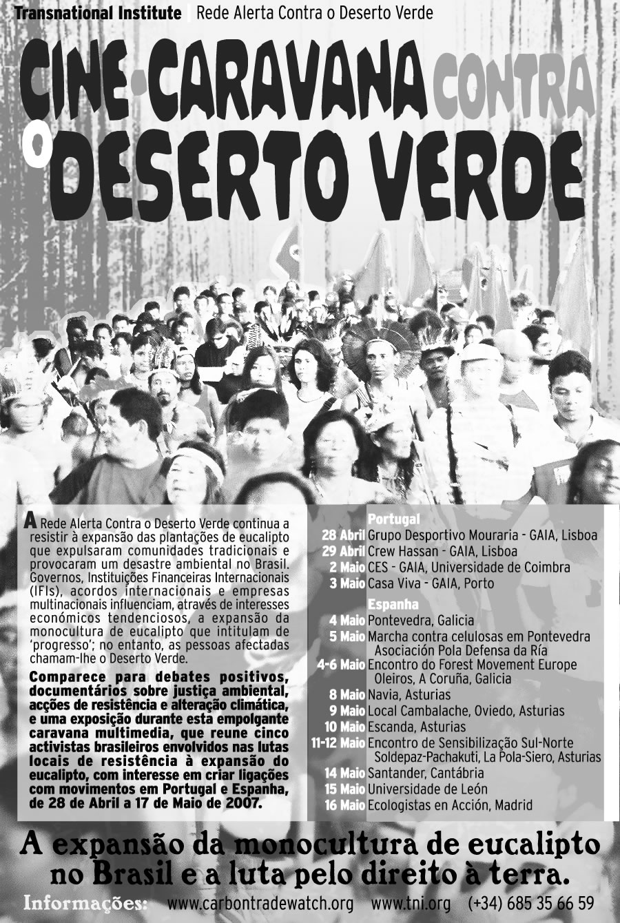Comparece para debates positivos, documentários sobre justiça ambiental, acções de resistência e alteração climática, e uma exposição, durante esta empolgante caravana multimedia, que reune cinco activistas brasileiros envolvidos nas lutas locais de resistência à expansão do eucalipto, com interesse em criar ligações com movimentos em Portugal e Espanha, de 28 de Abril a 17 de Maio de 2007.
